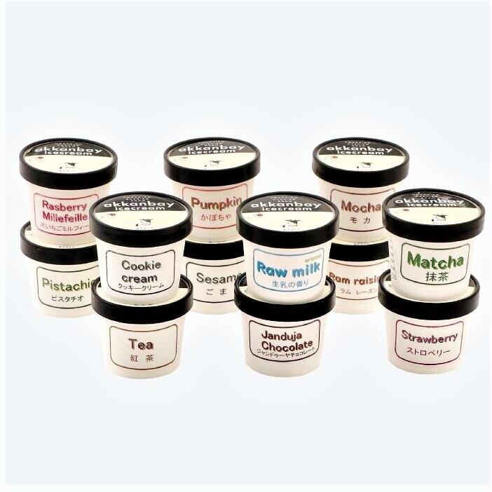 生乳の香り、ジャンドゥーヤ、木いちごミルフィーユ、ラムレーズン、かぼちゃ、モカ、ストロベリー、ピスタチオ、ごま、紅茶、抹茶、クッキークリームの12種類の味のセットとなっております。